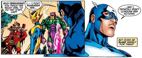 When Jolt asks about Rikki Barnes’ terrorist activities, Cap denies any knowledge of her while naturally condemning any such activities (while the mysterious narrator wonders if he feels responsible, which is also natural).