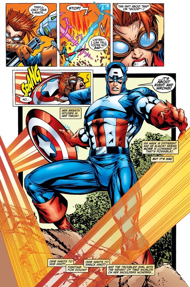 After Rikki and her Young Allies leave, Cap turns to Doom and continues Rikki’s mission, threatening him with news of other canisters of gas hidden in Latveria unless he loosens his grip on Counter-Earth.