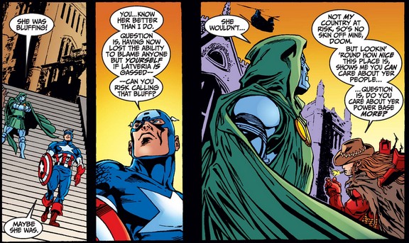 Doom argues that the canister Rikki did release was inert, but Cap asks if he is confident the rest are as well. (I like his slight pause before admitting that Doom knows her better than he does, at least that he remembers.)