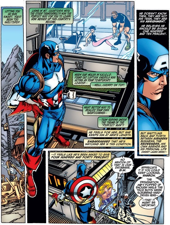 The heart of this post lies in issue #51 and 52, the first of which starts off with what the various ex-Thunderbolts are doing with their time off, while Cap makes himself comfortable in a training session with his new charges.