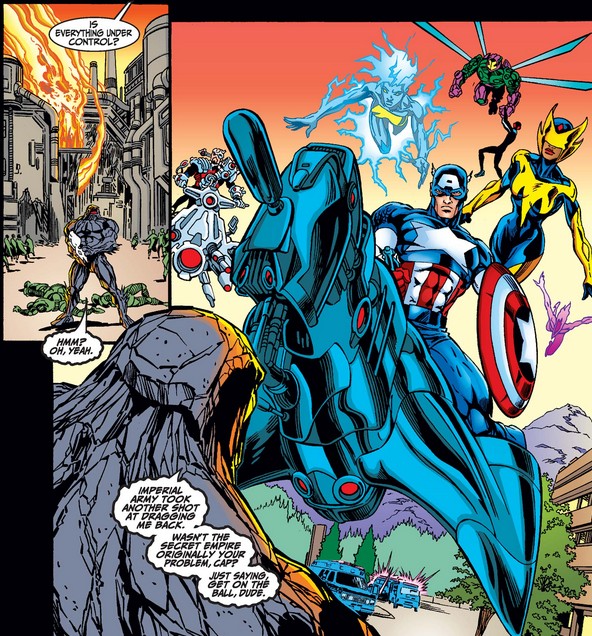 After an EMP forces their plane down in Latveria, Cap launches into field leader mode.