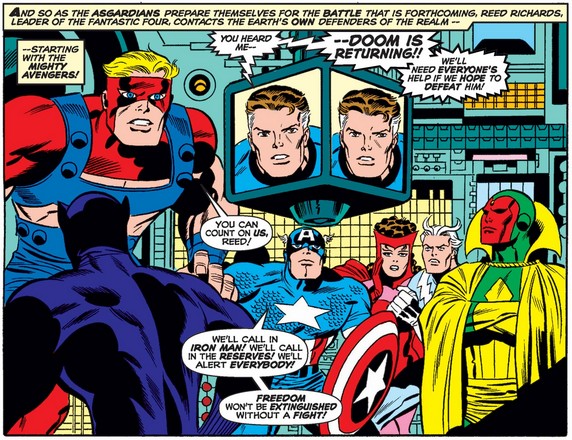 Finally, Cap shows up, again alongside the Avengers, in issue #11, after Doom makes his menace apparent and Cap pledges the entire team’s help and stresses the enormous stakes of resisting the fascist dictator of Latveria.