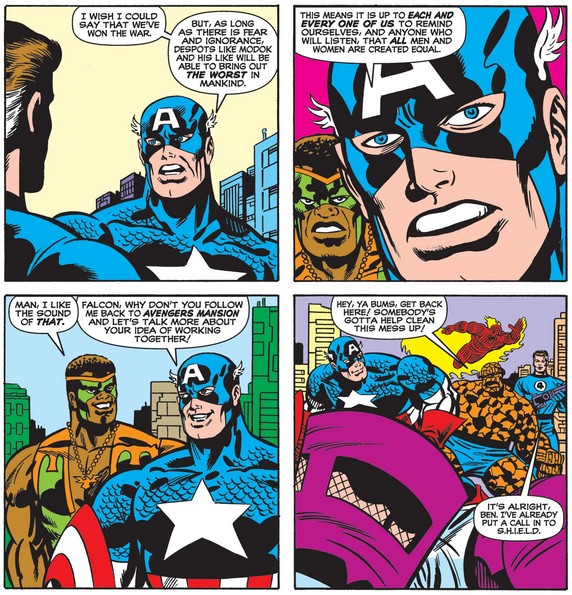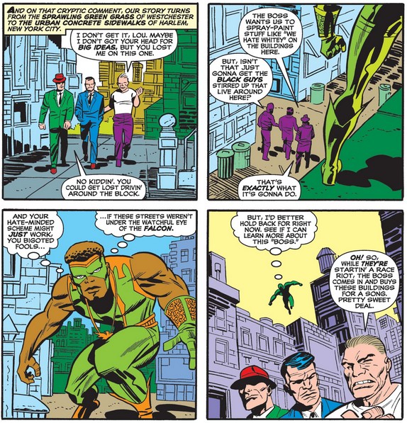 Before we see Cap in issue #4, we see the Falcon, who overhears three men planning to start a race riot to lower property values.