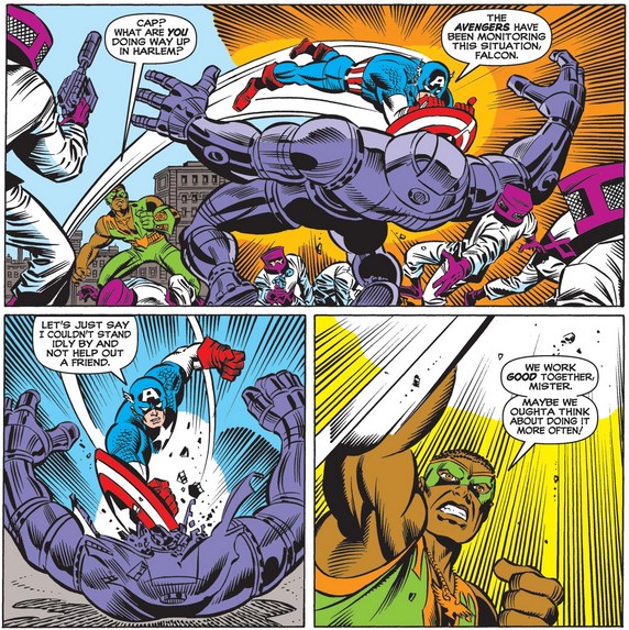 Cap explains how he happened to be on the scene, and Sam suggests a partnership (which would begin soon when the title is renamed Captain America and Falcon with issue #134, at least on the cover).