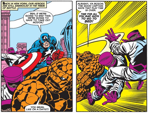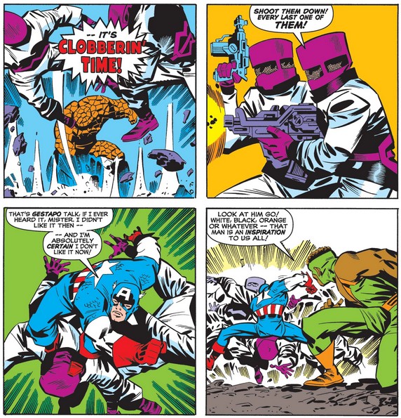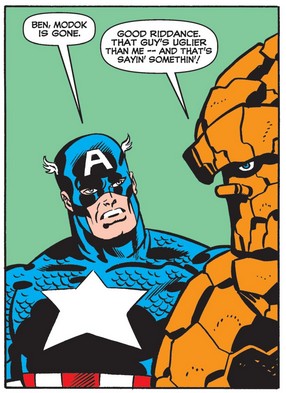 Eventually MODOK shows up, followed by the Fantastic Four, so we get to see the Thing deliver his classic catchphrase before Cap makes a Nazi allusion and Sam hails his role as a moral exemplar.