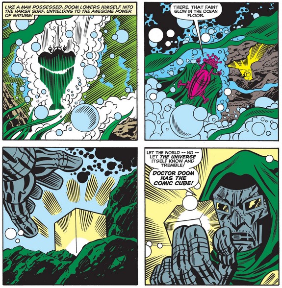 Even though we don’t see him much in this post, Doom lingers in the background of this entire story, and in this issue he explores the ocean to find the Comic Cube. (Surely a typo, but an unintentionally hilarious one.)