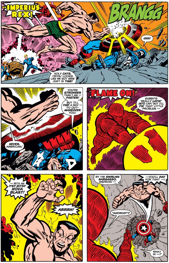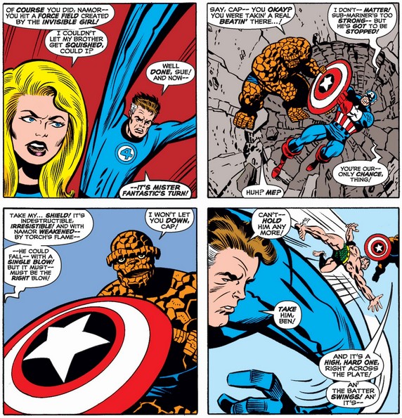 Cap acknowledges that the Sub-Mariner is stronger and faster than he is, but refuses to give up. (Namor also confused Johnny for the the original Human Torch, Jim Hammond, which helps Reed realize later that someone is controlling him.)