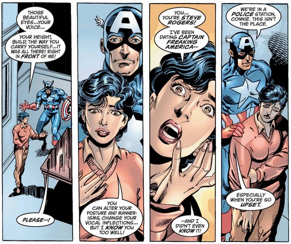 Given that they’re in an interrogation room in a police station, Cap is naturally concerned about being overheard through the two-way mirror, which Connie dismisses before bringing up Sharon Carter (ouch). Cap begins to explain the standard rationale for secret identities…
