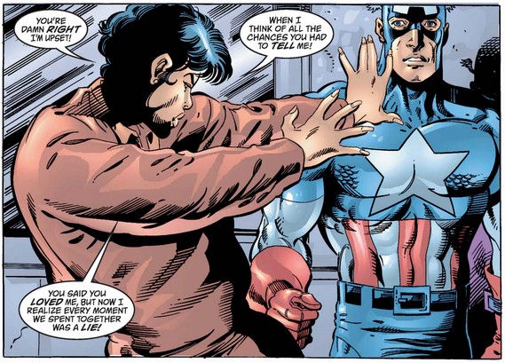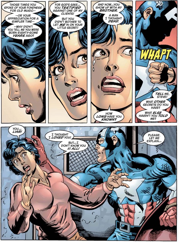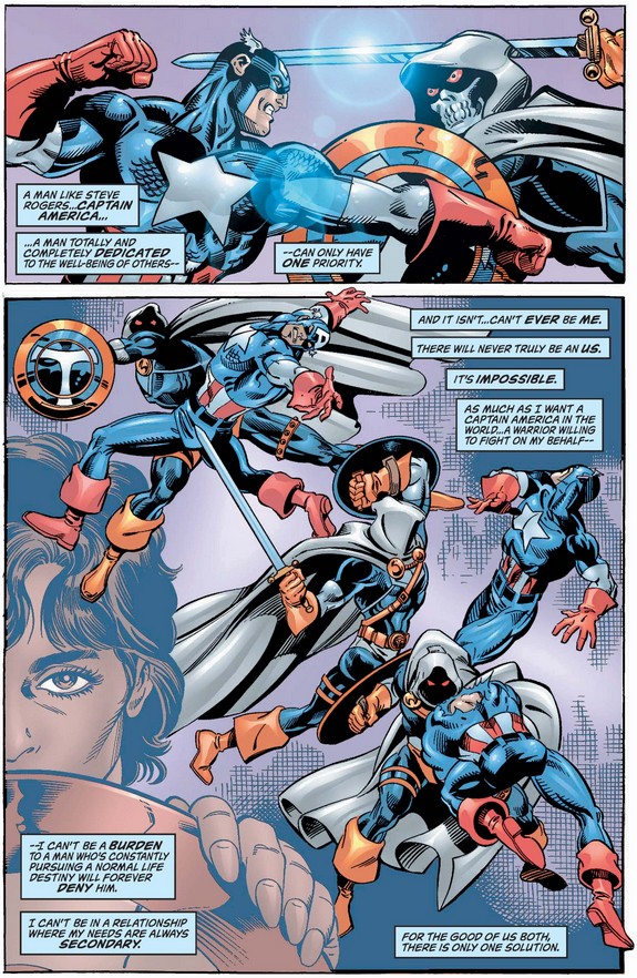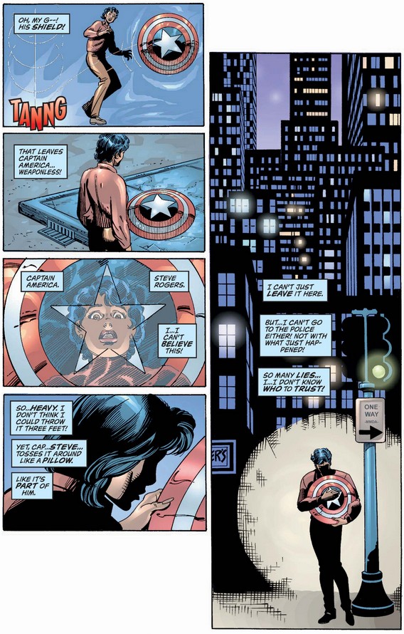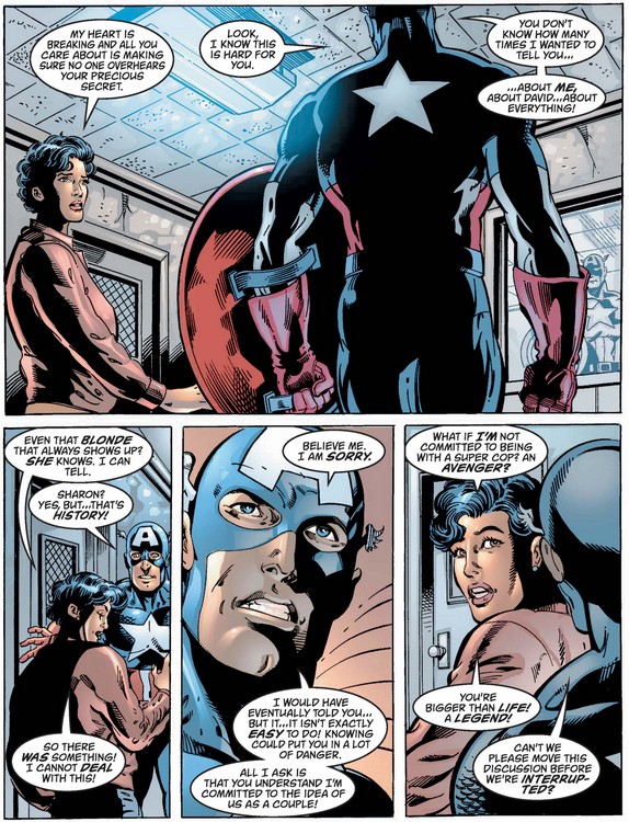 …but she exaggerates the degree to which Cap relies on his mighty shield, before considering the nature of his day-to-day life and regretting getting angry with him for his tardiness and absences.