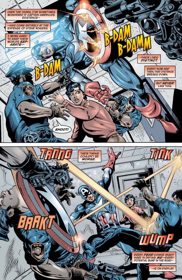 …until they are interrupted by a group of men posing as police, looking to get one up on the Sentinel of Liberty. While defending Connie, Cap ponders the cost of his dual life—a familiar refrain to longtime readers—and fears that this incident in particular will drive Connie away for good. (To his credit, though, it does support his reluctance to tell her his secret.)