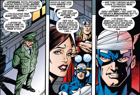 Although things look bad with Kang’s impending fullscale invasion of Earth and all, Cap and the Wasp remind the good general that the ends do not justify the means when he suggests a particularly problematic means—and then puts the responsibility on the Avengers to give him a reason not to use it.