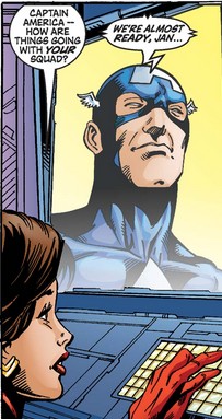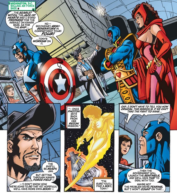 Cap reports to Janet on preparations for his “squad”—including Jack of Hearts, who joined the team in issue #43—and lays out the dual concerns of fighting Kang and preventing the U.S. government from using their Sentinels.