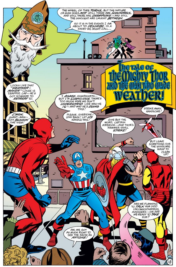 This storyline will continue in the next Avengers post, but we have one more comics to discuss here. Thor: Godstorm is a three-part miniseries that features homages to the classic Stan Lee/Jack Kirby run on the character, and the first issue guest-stars the mighty Avengers, written in Lee’s inimitable style by current Avengers scribe Kurt Busiek and drawn with Kingly panache by Steve Rude. Below, we see Cap handling crowd control while the team decides how to face… the Weather-Maker!
