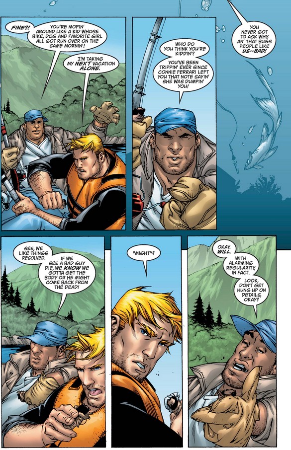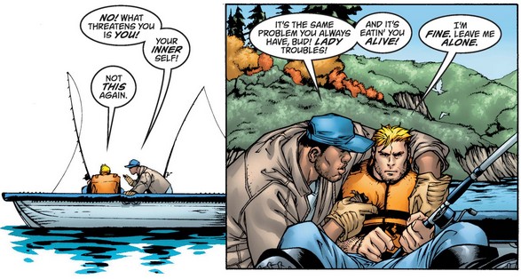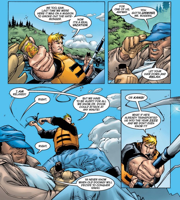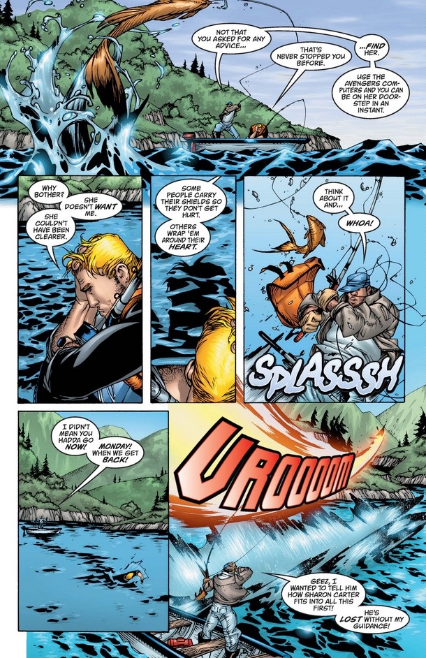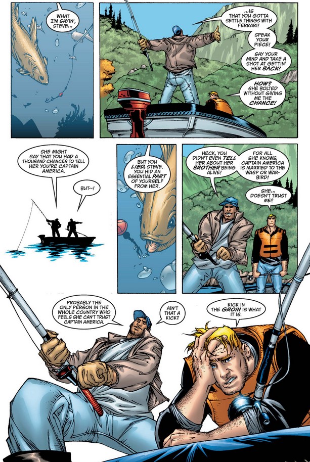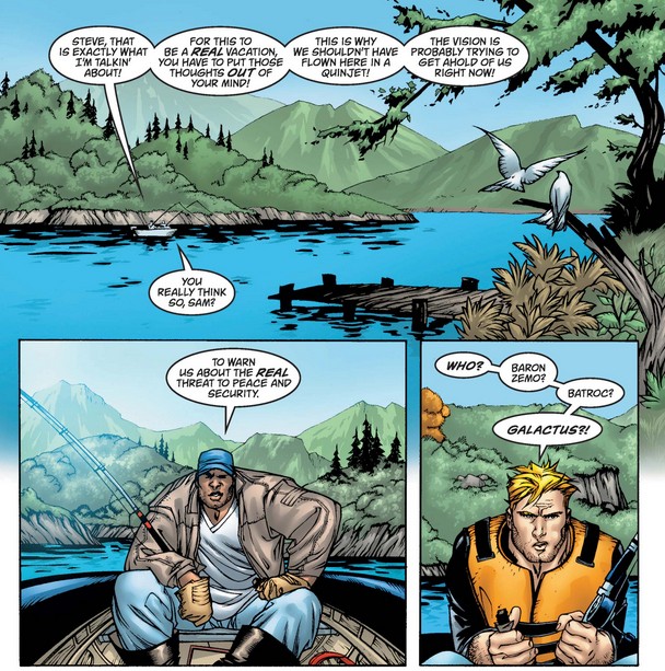 We start on a lake in Idaho, a more relaxed version of Steve Rogers’ and Sam Wilson’s fishing trip from issue #25, although one of them doesn’t seem very relaxed, much to the consternation and amusement of the other.