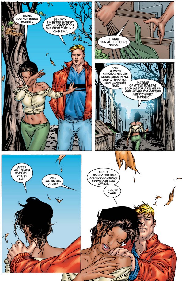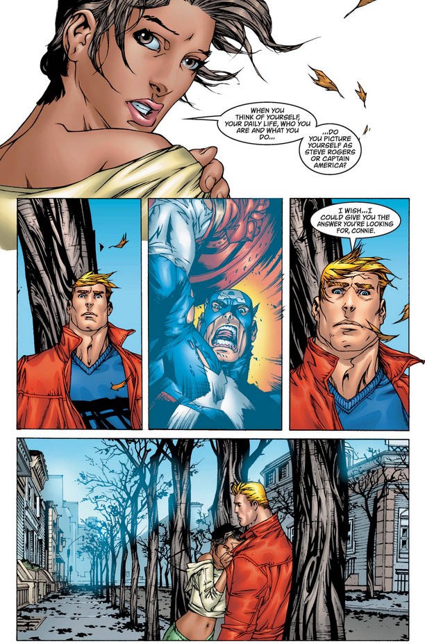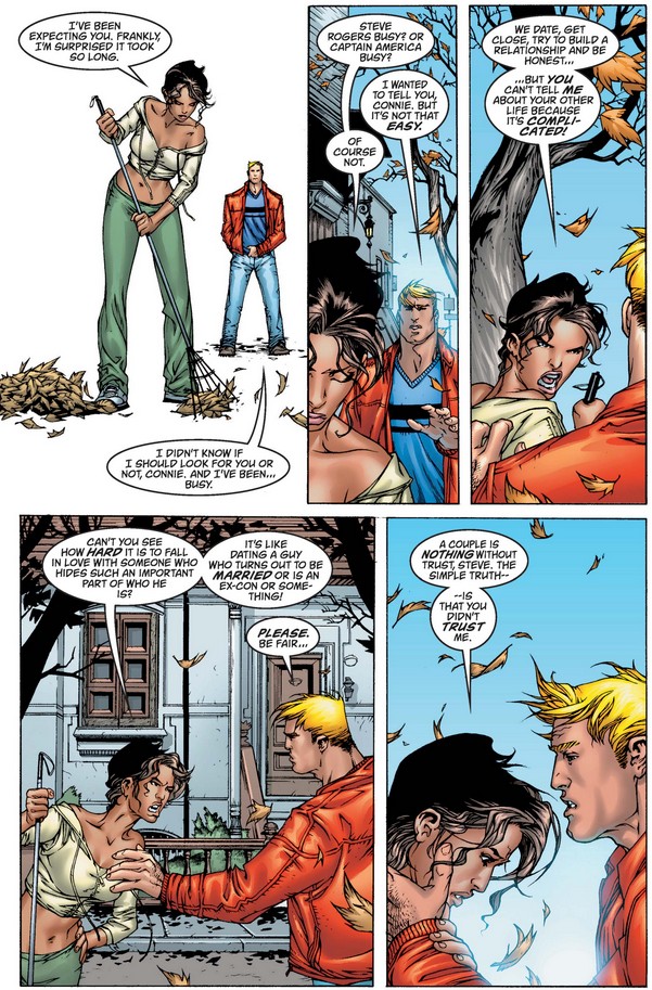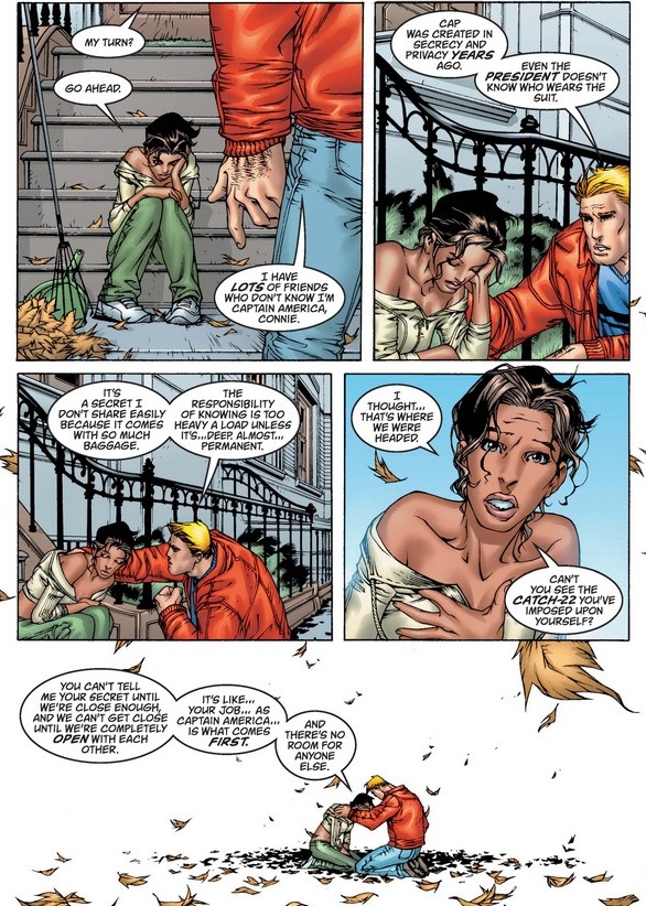 Steve tries to explain how seriously he takes his double identity and the burden it places on those he shares it with, but she counters with the impossible bind that put them in, not to mention the realization that Captain America is always the priority…