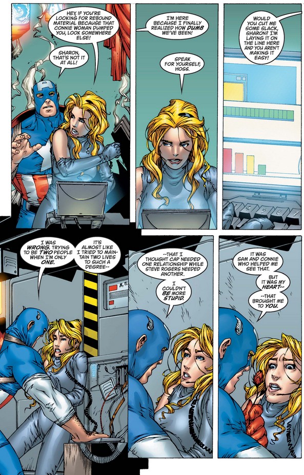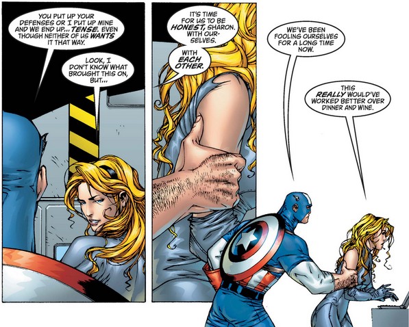 Sharon points out the obvious (even if she doesn’t know Cap was just in Ohio), but Cap persists, arguing that he needs to be with someone who can handle both of his identities (or even just the dominant one).