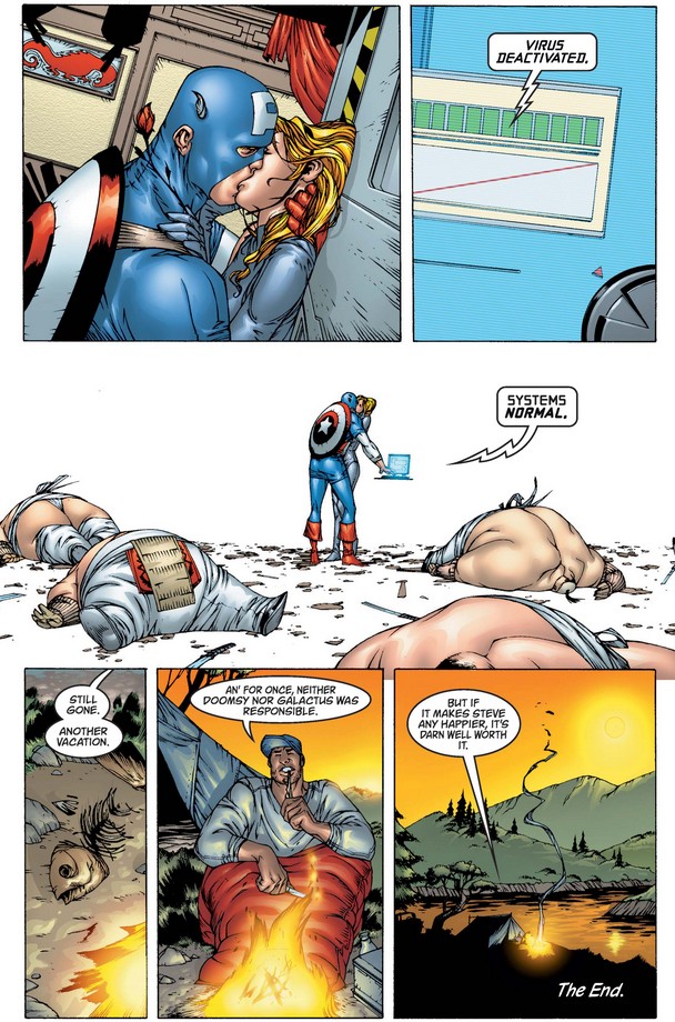 This issue deals with two romantic entanglements involving Captain America as we head into the climactic final issue of this run next month. (Do not worry, Sue Storm is not one of them, despite the cover which, at least to me, seems to show our hero emerging from the shadows to sneak up on the Invisible Woman.)
