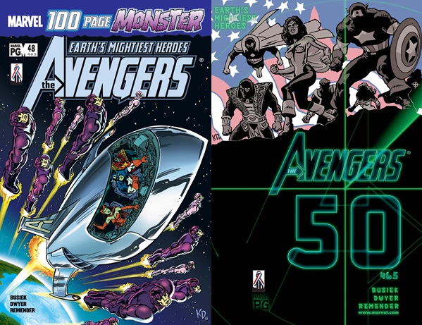 Avengers (vol. 3) #50, March 2002: Kurt Busiek (writer), Kieron Dwyer (pencils), Rick Remender (inks), Tom Smith (colors), Richard Starkings and Albert Deschesne (letters). (More details at Marvel Database.)