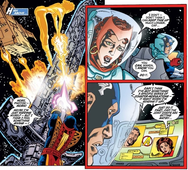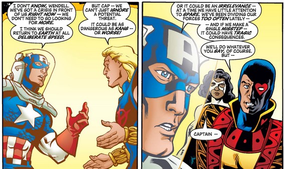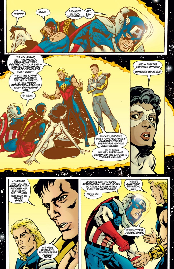At the end of the issue, Kang destroys their ship, and the team wakes up in issue #50 to find… well, that they woke up at all. Cap immediately wants to confront Kang, but Quasar says there’s an even greater priority…