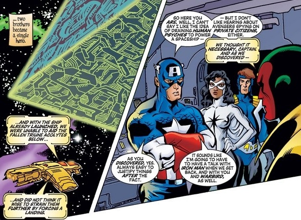 As Cap is updated on other events that occurred in issue #48—specifically, that Justice and Firestar infiltrated the Triunes in disguise, as well as that the Triunes’ ship is powered by the psychic energy of their followers—he is disappointed that his fellow Avengers that they decided the ends justified the means, and plans an ethics class when they get home.