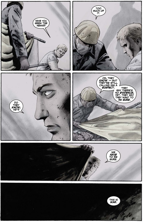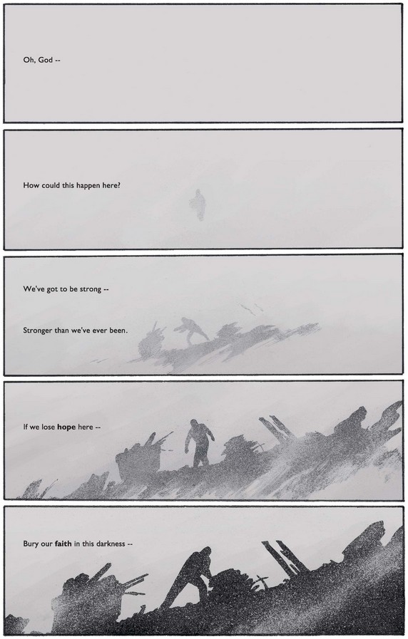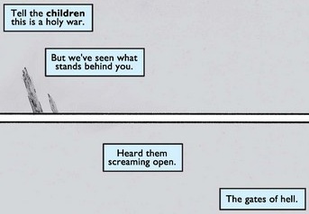 The next double-page spread sees Steve continue searching while his inner monologue speaks to the terrorists themselves, words on which we zoom in below.