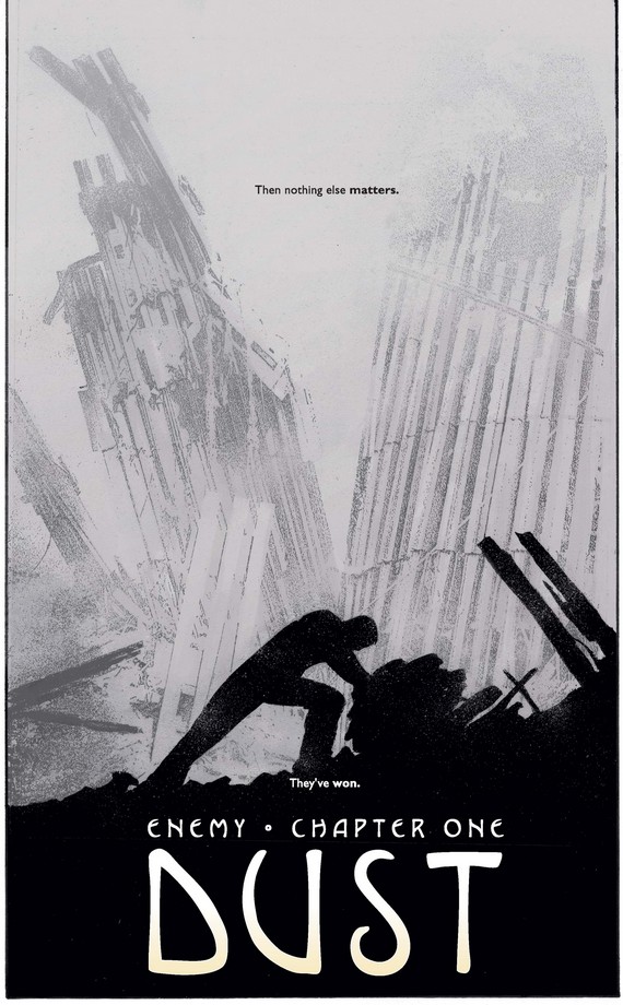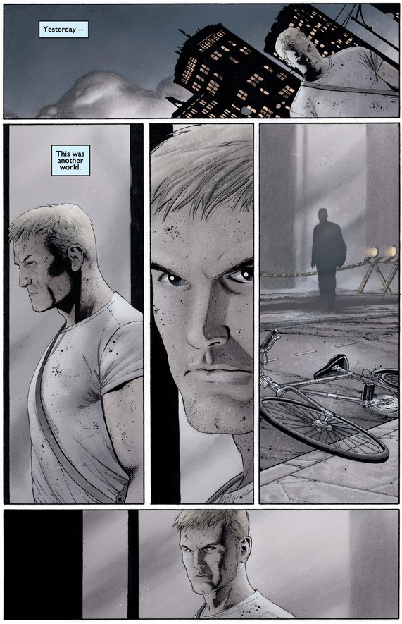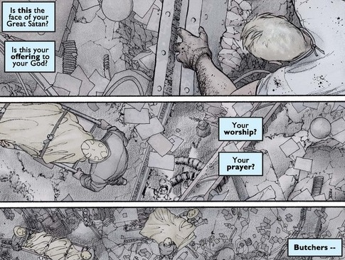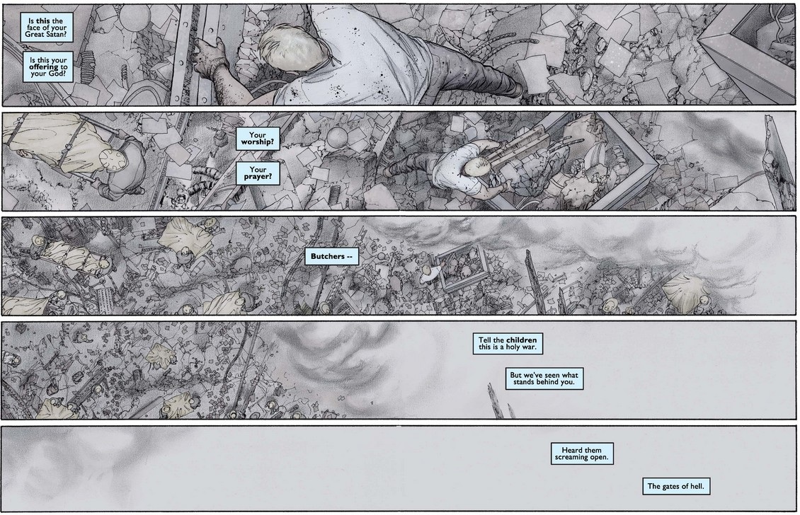 …before the story jumps seven months ahead to April 2002 (when this comic was released, natch). There is another terrorist attack, this one on Easter Sunday, involving countless small explosives airdropped by a man named al-Tariq over Centerville, a town of 600 somewhere in America, many of whom are being held hostage.
