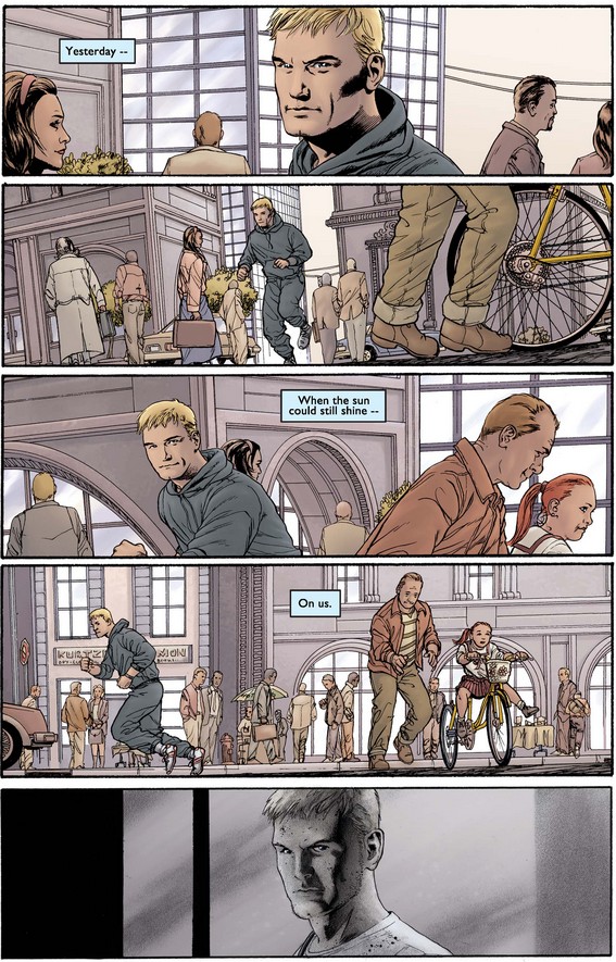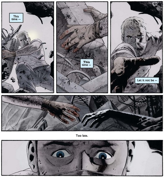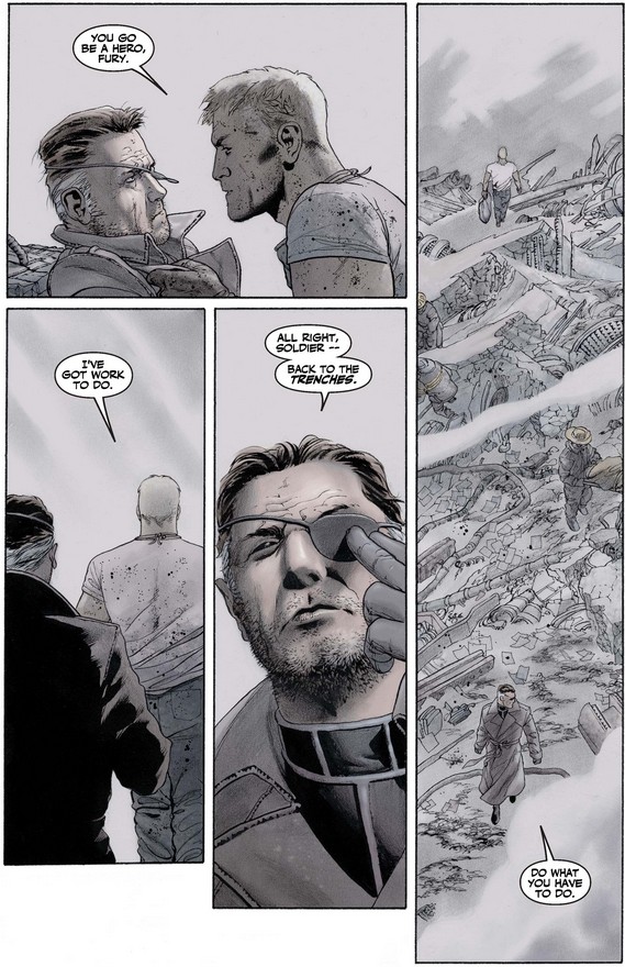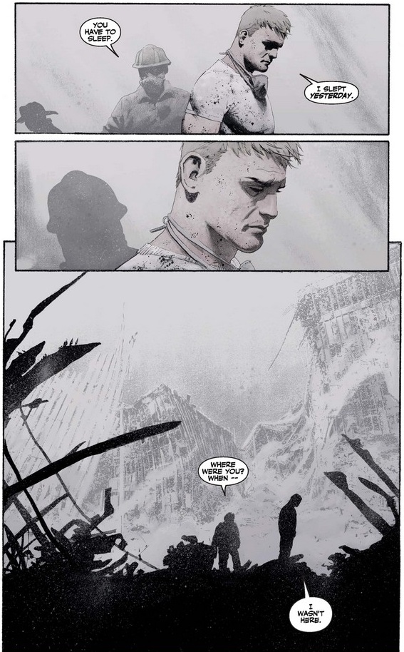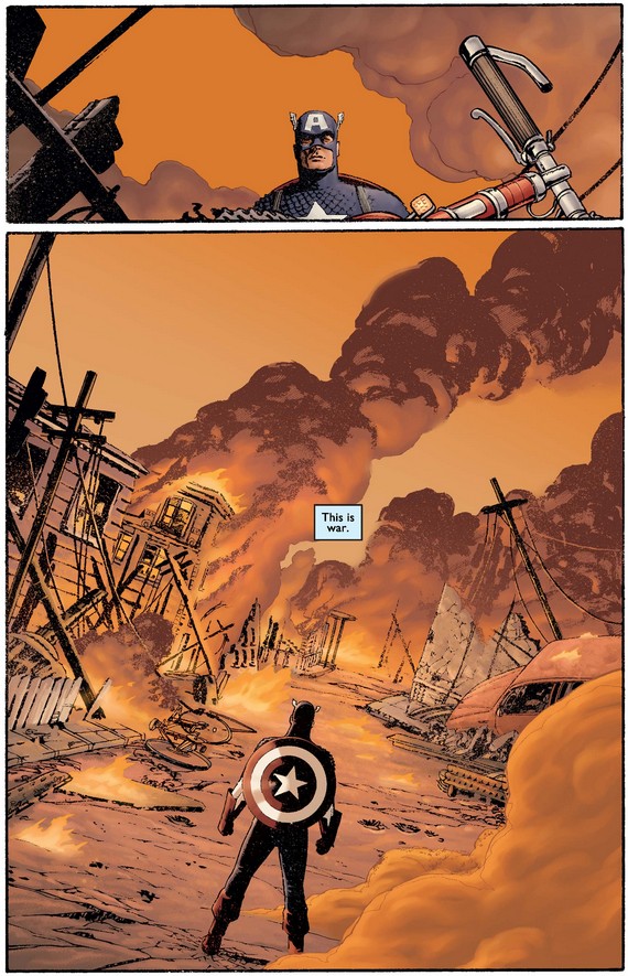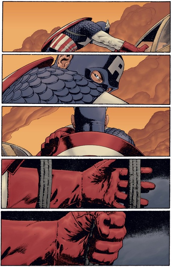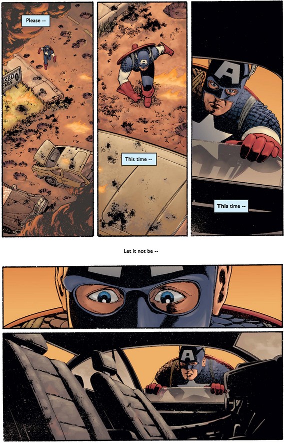 What is Steve thinking below as he looks at the shield and then the smoldering wreckage? Perhaps he’s asking himself if he could have done more, what he would have done had he been there, and most important, what he should do now.