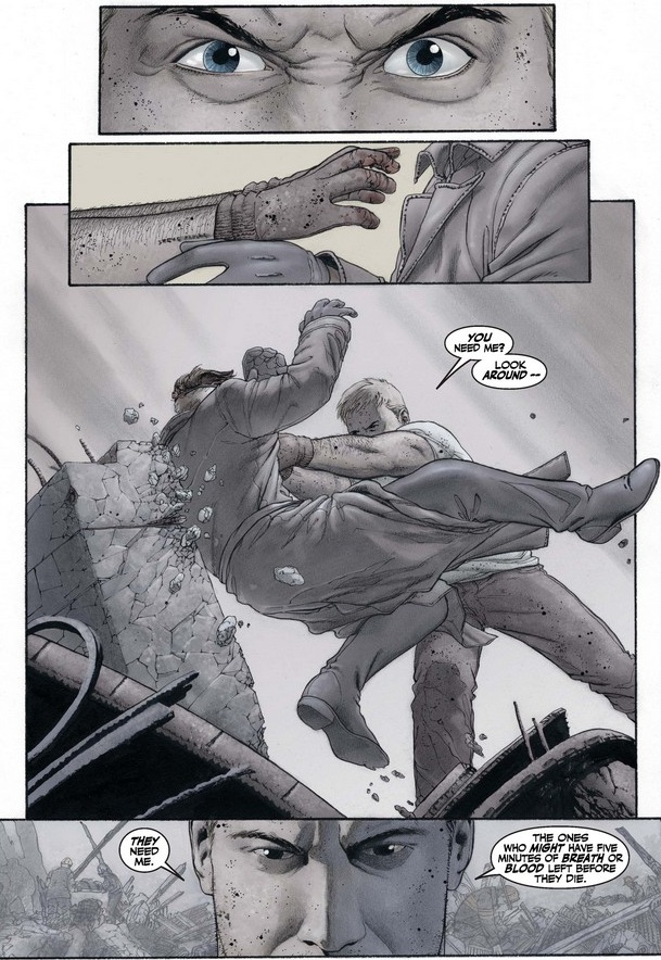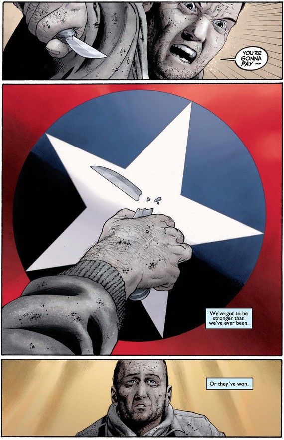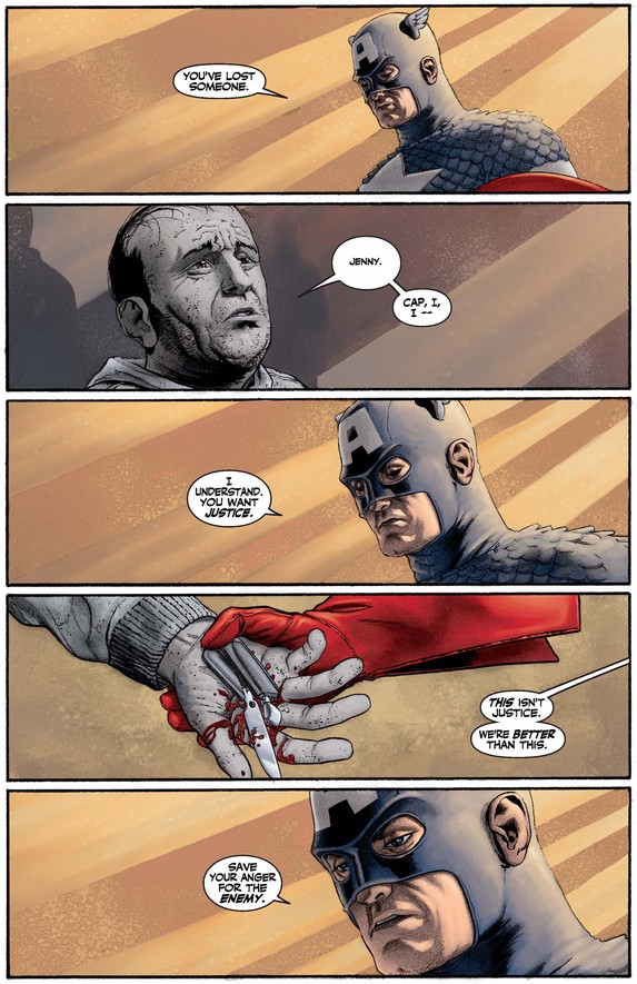 Even more touching, the first man asks Cap to go easy on his attacker, to whom he reaches out in sympathy, which gives Cap a little bit of hope that they can rise above the impulse for revenge and pursue justice instead.