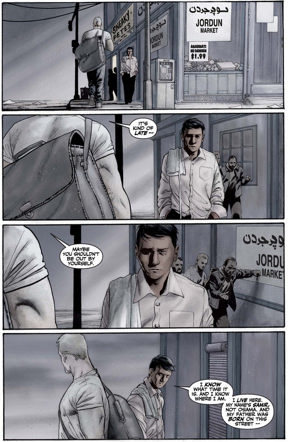 Later, he encounters a man of Middle Eastern descent and recommends he be careful, all too aware of the likely reactions of some to anyone who looks like “someone.” The man correctly asserts his right to walk the streets as comfortably as he did yesterday…
