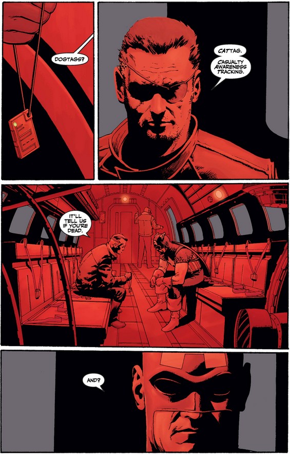 After dropping his CATtag and jumping out of the plane without a parachute—one of my favorite moves—Cap makes an ominous assertion, hopefully just expressing his rage and frustration and not conceding control to them.