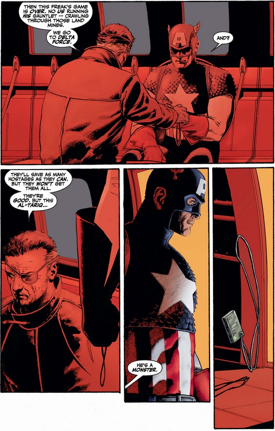 This issue launches the fourth volume of Captain America, this one under the Marvel Knights imprint, which by this point had already featured groundbreaking re-imaginings of Daredevil and Black Panther. The intent was to ground the stories of Captain America more firmly in the real world—and nothing was more current in the United States of early 2002 than terrorism, with the wounds of September 11, 2001, still very fresh. This focus extended to the Marvel Universe as well, as we will see for most of this first issue until the time jumps ahead several months to another terrorist attack. Both incidents force Cap to confront a new type of warfare as well as the wrongs done by his own country—and perhaps those he has done as well (at least as he perceives them).