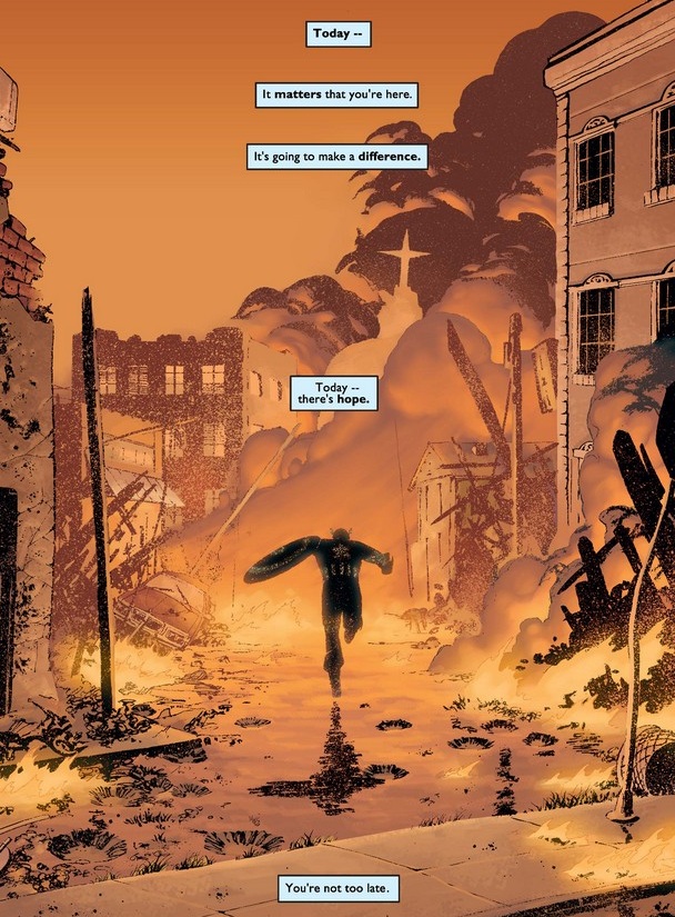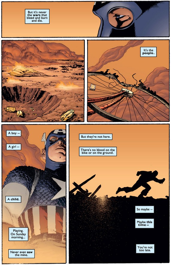 As he runs into the fire, Cap affirms that this time, he is not too late to save lives, and he will do better.